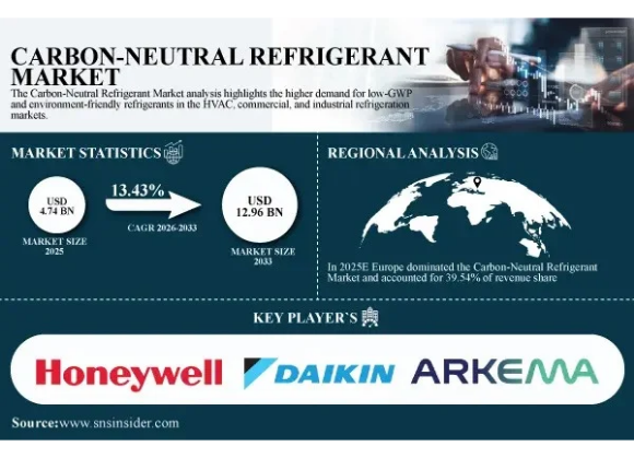 Il mercato globale dei refrigeranti carbon neutral è destinato a crescere da 4,74 miliardi di dollari nel 2025 a 12,96 miliardi entro il 2033, con un tasso di crescita medio annuo (CAGR) del 13,43% tra il 2026 e il 2033. Lo rivela un recente rapporto di SNS Insider, che evidenzia come la spinta principale provenga dalle regolamentazioni ambientali più severe contro i refrigeranti ad alto potenziale di riscaldamento globale (GWP) e dalla crescente domanda di sistemi di raffreddamento a basso impatto e ad alta efficienza energetica.