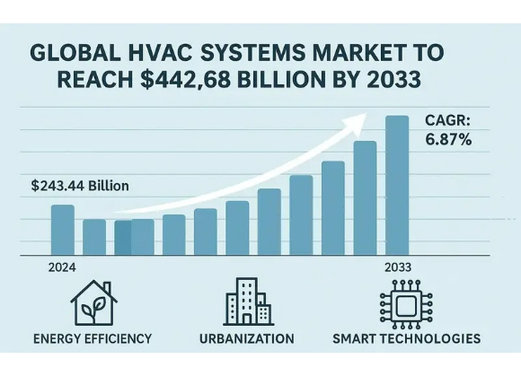 Il mercato mondiale dei sistemi HVAC è destinato a passare da 243,4 miliardi di dollari nel 2024 a 442,7 miliardi nel 2033, con un tasso di crescita medio annuo del 6,87%, secondo un nuovo rapporto pubblicato da Research and Markets e ripreso da Refindustry.