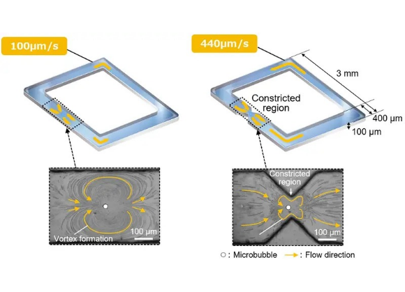 L’Università di Kyoto ha sviluppato un metodo che utilizza microbolle generate da riscaldamento locale e forze di Marangoni, create da gradienti di temperatura tra liquido e vapore, per indurre il movimento del fluido. Mitsubishi Electric ha applicato il metodo a un microcanale da 3 × 3 mm con sezione di 100 × 400 μm, raggiungendo una velocità di flusso di 100 μm/s senza alcuna pompa. Attraverso l’ottimizzazione delle bolle e del design del canale, la velocità è stata successivamente portata a 440 μm/s.