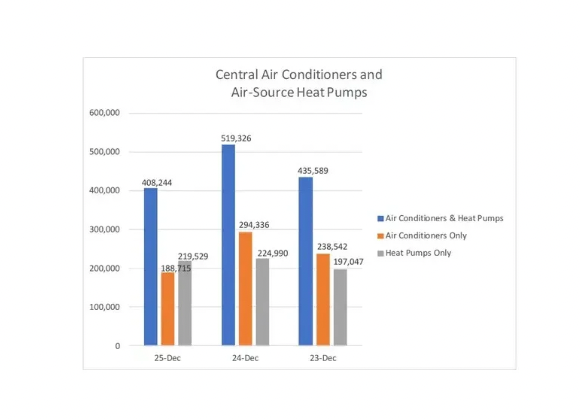 Per quanto riguarda le fasce di capacità nel mese di dicembre 2025, il volume maggiore si è concentrato nella gamma 33-38,9 (000) BTUH, con 87.491 unità spedite (circa 9,7-11,4 kW). Altre fasce ad alto volume sono state 22-26,9 (000) BTUH, con 78.473 unità (circa 6,4-7,9 kW), e 27-32,9 (000) BTUH, con 55.389 unità (circa 7,9-9,6 kW).