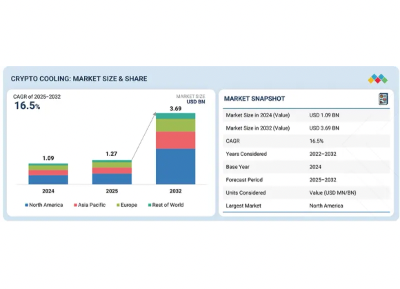 Il mercato globale delle soluzioni di raffreddamento per il settore delle criptovalute è destinato a crescere in modo significativo nei prossimi anni. Secondo quanto riportato da Refindustry, che cita un’analisi di MarketsandMarkets, il comparto passerà da 1,27 miliardi di dollari nel 2025 a 3,69 miliardi entro il 2032, con un tasso di crescita medio annuo del 16,5%. La crescita è legata alla crescente professionalizzazione delle attività di mining di criptovalute, all’aumento dell’intensità computazionale e alla necessità di sistemi di gestione termica in grado di proteggere l’hardware dal surriscaldamento e garantire prestazioni costanti.